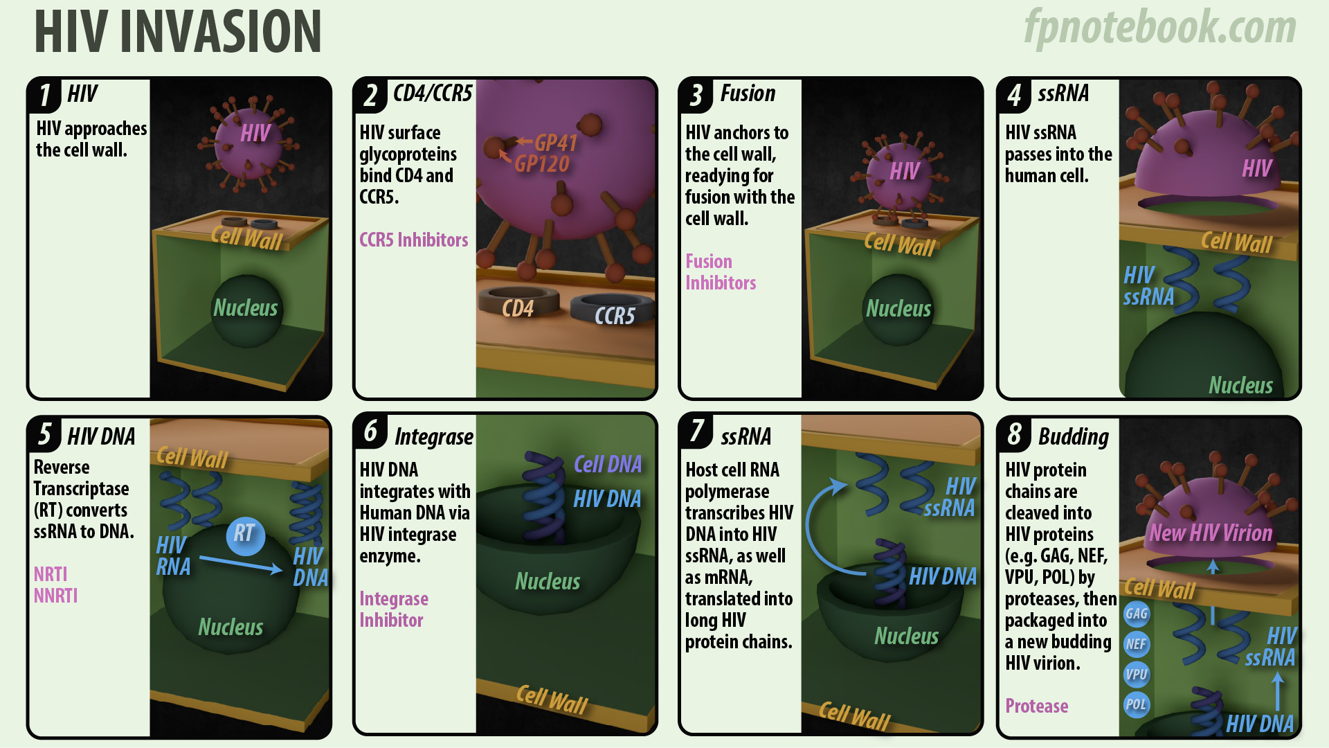 - cDNA penetrates the host cell's nucleus and integrates with host DNA via HIV integrase enzyme